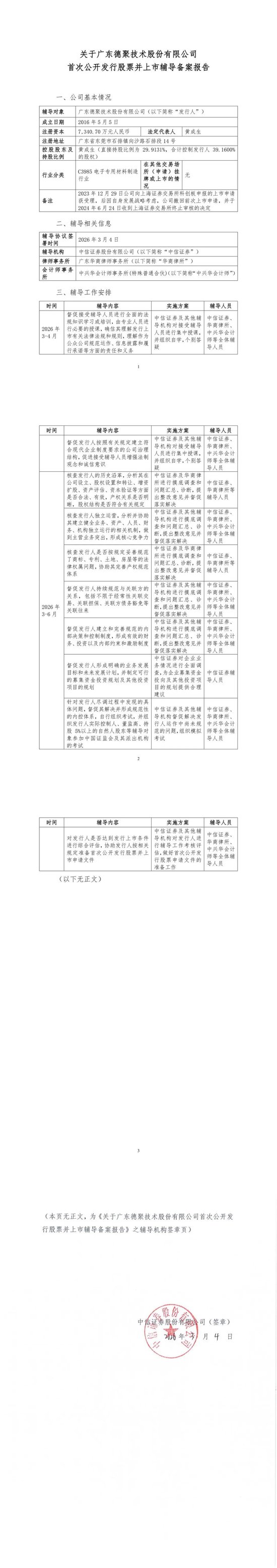 2026年3月11日,证监会官网显示,中信证券已提交《关于广东德聚技术股份有限公司首次公开发行股票并上市辅导备案报告》。辅导机构为中信证券股份有限公司,律师事务所为广东华商律师事务所,会计师事务所为中兴华会计师事务所(特殊普通合伙)。
